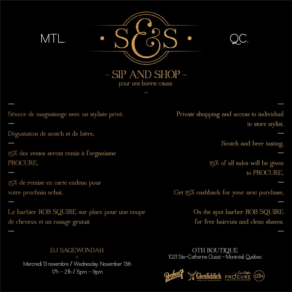 Le mercredi 13 novembre de 17 h à 21 h aura lieu notre premier événement SIP & SHOP : une séance de magasinage avec votre propre styliste, une dégustation de bière et de scotch ainsi qu’un rabais de 15 % applicable sur votre prochain achat en magasin. Le barbier Rob Squire sera sur les lieux et offrira coupe de cheveux et rasage aux intéressés. Un montant équivalant à 15 % des ventes totales de l’événement sera versé à l’organisme PROCURE. Nous vous y attendons nombreux!